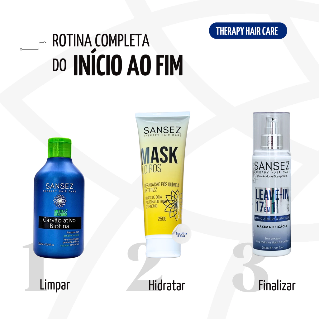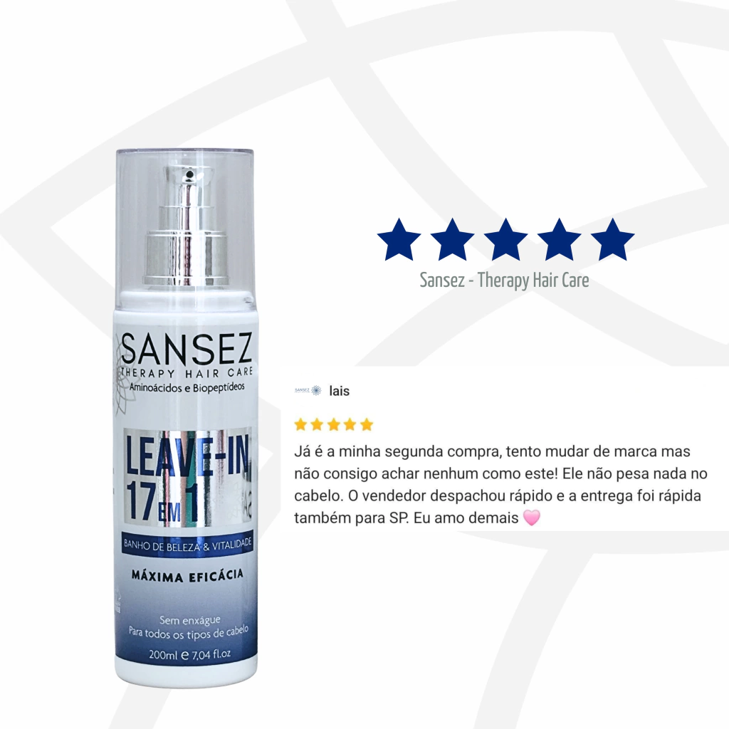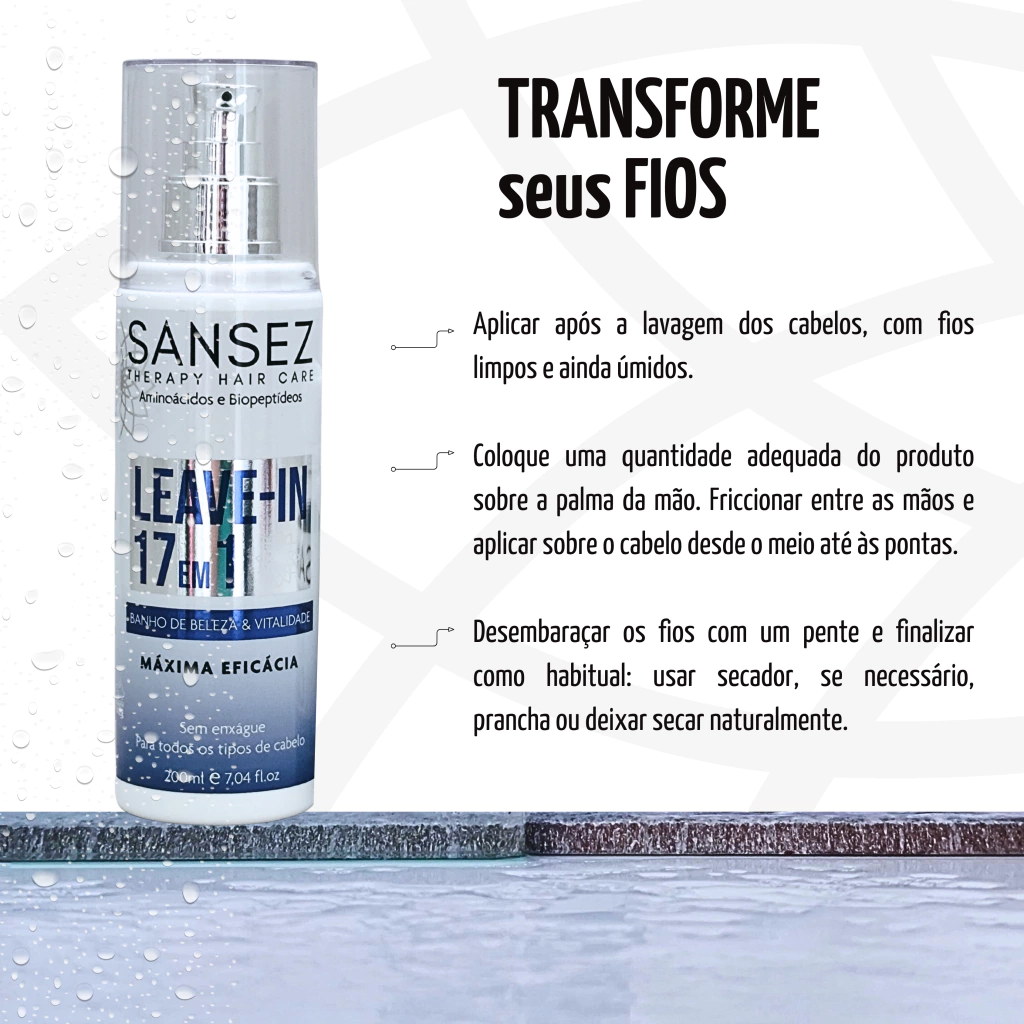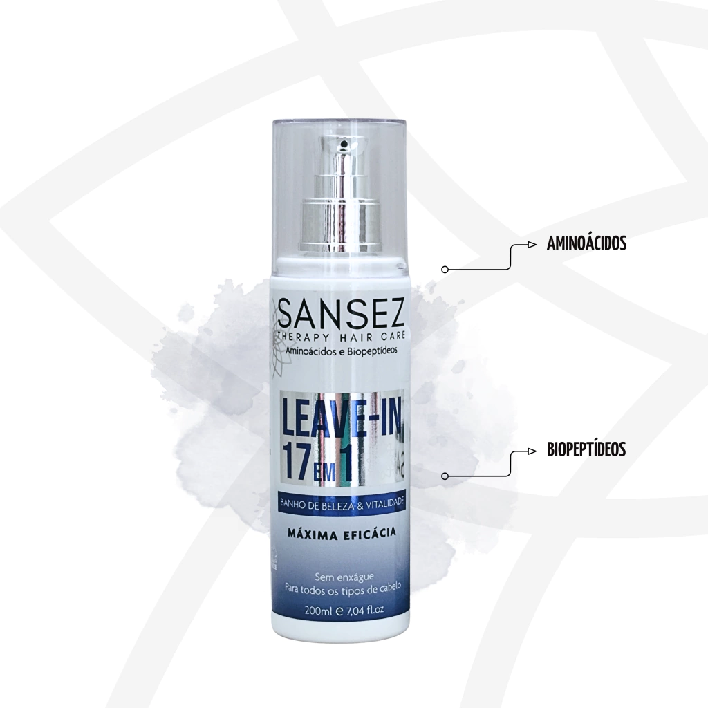 O Sansez LEAVE-IN 17 em 1 é o tratamento multifuncional que seus cabelos precisam. Desenvolvido com tecnologia de ponta, ele cria uma película protetora ao redor dos fios, blindando contra o calor, a umidade, os raios UV-B e os danos químicos – sem pesar, sem oleosidade e com resultado de salão.
